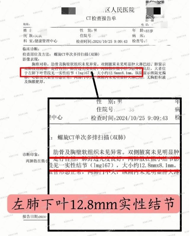 就拿这个患者来说,首次体检就发现12.8mm的实性结节。患者一看到检查结果就慌了,又不知道下一步该怎么处理。